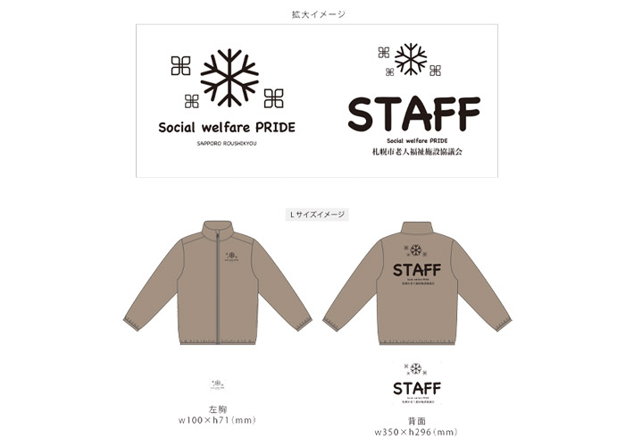 左胸にロゴ、背面にロゴとSTAFFの文字と協議会名を入れたこちらのデザインから名入れ作成を行いました。