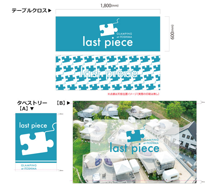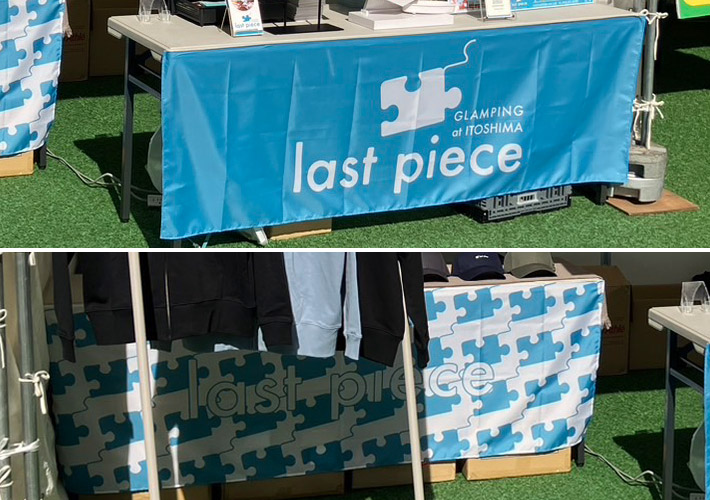 テーブルクロスはロゴデザインを2種、タペストリーはロゴデザイン1種とフルカラー写真が入ったデザイン1種から名入れ作成を行いました。