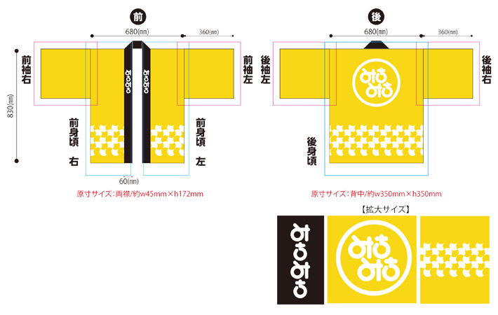 黄色地の法被の背面にロゴ、腰部分にイチョウの和柄、襟に文字を入れたこちらのデザインから名入れ作成を行いました。
