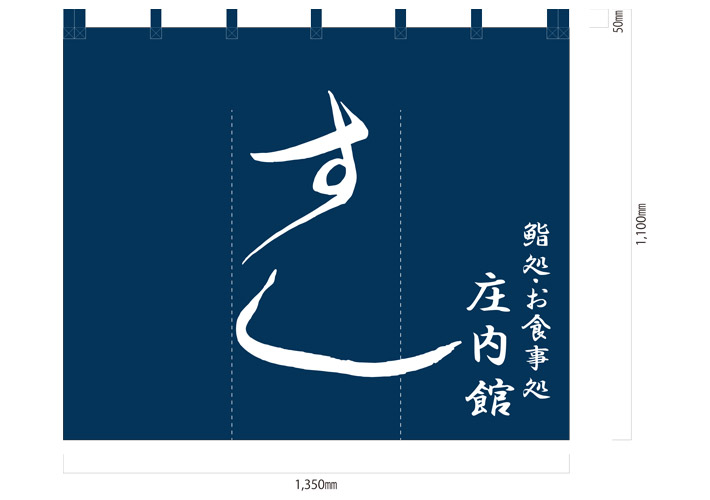 紺色のベタ地に白色で「すし」の文字と店名が入ったこちらのデザインから名入れ作成を行いました。