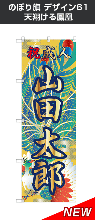 男性向けに派手かっこいいデザインや女性向けに華やかでゴージャスな絵柄など全53種のテンプレートの中からオリジナル成人式のぼり・撮影用の前撮りのぼりを特注作成する際にお好きなデザインを選択する事が可能となっておりますので、下の一覧からごゆっくりお選び下さい。