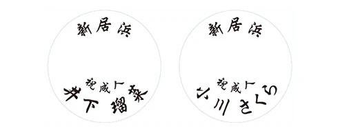 事例105と同様に、こちらの成人式用和傘も白無地の本体にデザインテンプレート「1-1」を用いてセミオーダー製作致しました。黒い縁取りの中に文字だけを名入れしたシンプルな番傘は、華やかな赤い振袖にお似合いで大胆さを感じさせます。振袖を引き立てる撮影用小物として、あえてシンプルなデザインを選ぶのもお薦めです。