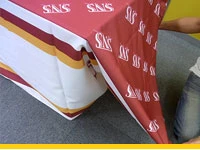 立体ボックス型のようなテーブルに合わせた縫製は行わない1枚もののテーブルクロスとなりますので、設置時に長さを調整することで様々な机サイズに対応することができます。1枚オーダーメイド制作しておくことで就職説明会や展示会イベントなどにマルチに使い回しでき、価格面でのメリットも◎。